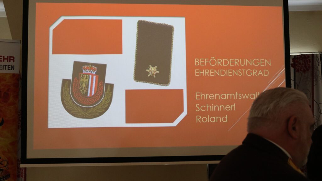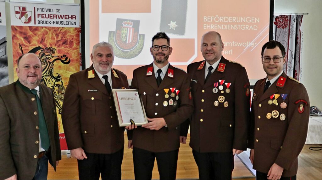 • Roland Schinnerl wurde in Anerkennung seiner 20-jährigen, gewissenhaften Tätigkeit als Kassier, seines außerordentlichen Engagements für die FF Bruck-Hausleiten sowie seiner langjährigen, verdienstvollen Mitarbeit der Ehrendienstgrad Amtswalter verliehen.